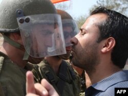 Израилдик аскер менен палестиналык демонстранттын "жүзмө-жүз таймашы". Батыш Иордандын Билин кыштагы. 24-сентябрь 2010