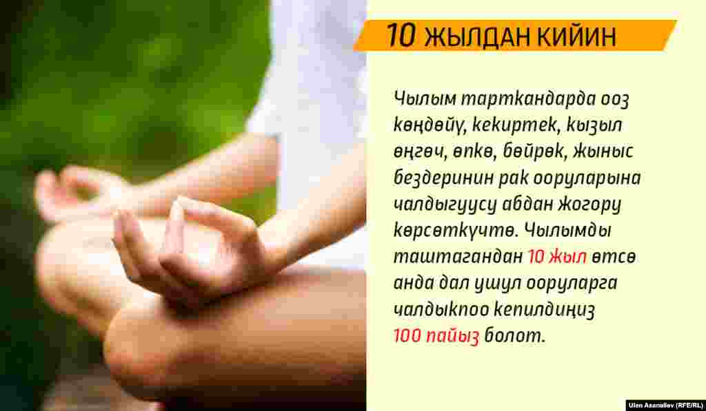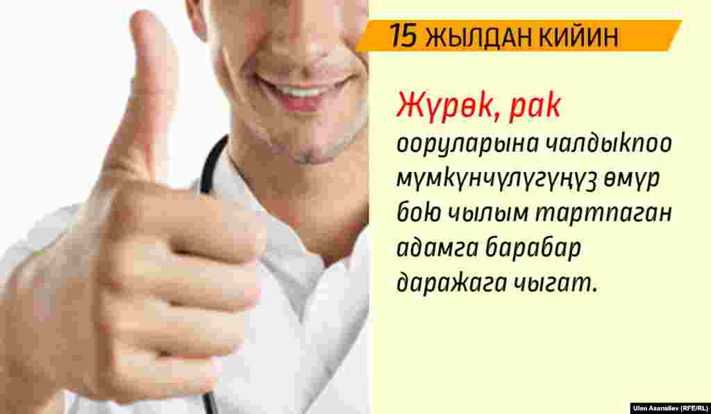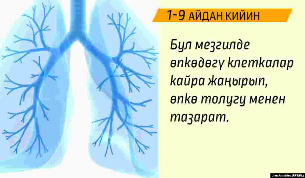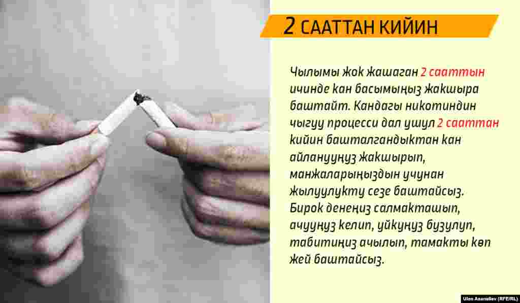Healthline аттуу коомдук уюм атайын иликтөө жүргүзүп, тамекини таштагандан кийинки 20 мүнөттөн тарта 15 жылдык убакыт ичинде адам саламаттыгындагы төмөнкү кубулуштарды жазган.