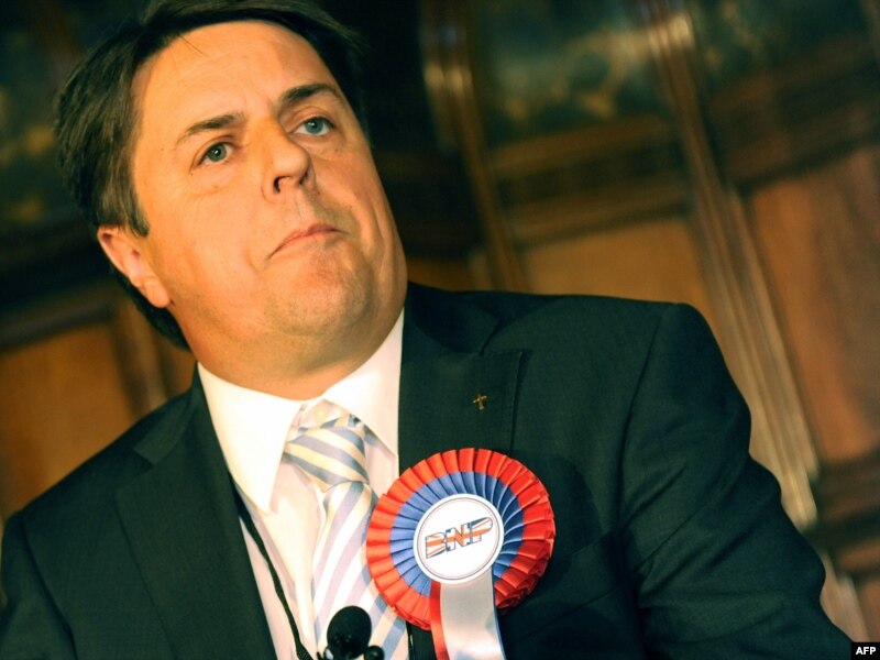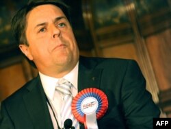 Британ улуттук партиясынын төрагасы Ник Гриффин шайлоодогу партиянын жеңишин майрамдоодо. 8-июнь.