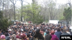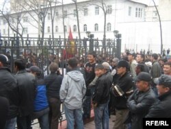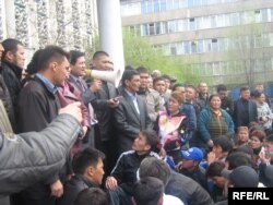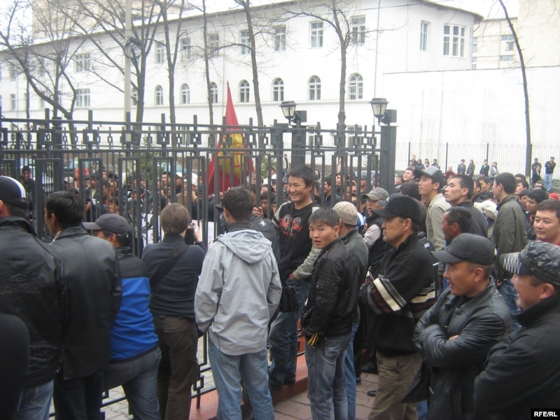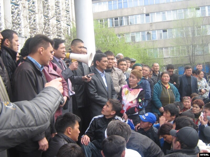 “Коррупцияга жол жок!”, “Бюрократияга жол жок!”, “Бакиев алынып келинсин!” деп кыйкырып, 16-апрелде түшкү саат үчтөр чамасында 200дөн ашуун адам Улуттук телерадио корпорациясынын алдына чогулушту.