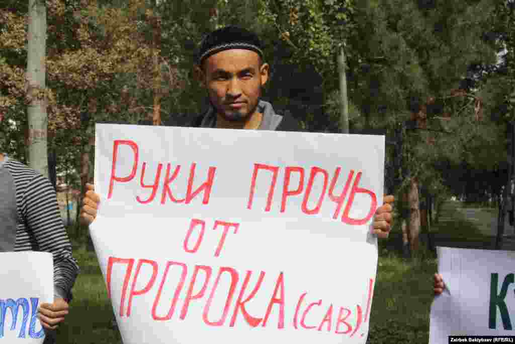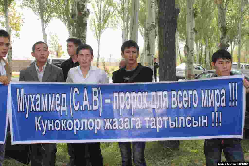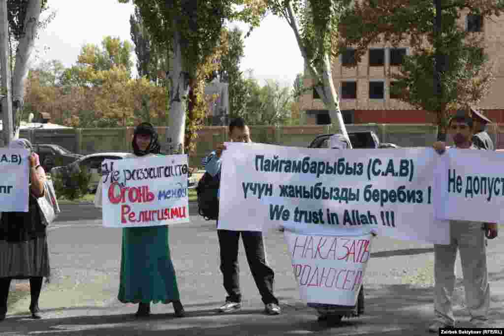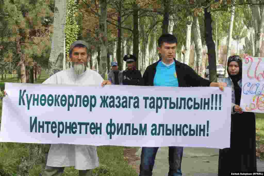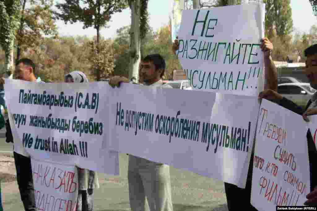 “Бейкүнөө мусулмандар” тасмасына нааразылык билдирген 100 чакты жаран бүгүн Бишкектеги АКШ элчилигинин алдында митингге чыкты.