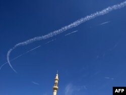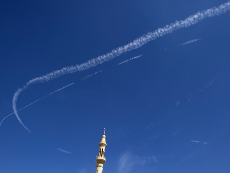 НАТОнун аскерий учагынан чыккан түтүндүн изи. Курчоодогу Мисрата шаарындагы мечиттин минарети. 19-апрель 2011